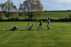 Zápas byl od začátku tvrdý a bolel. Domácí se snažili naši obranu překvapit dlouhými centry, které ovšem skvěle hrající soperská dvojice T.Fatka-J.Král v pohodě sbírala. Postupem času jsme začali vystrkovat růžky i my a hrozili rychlými brejky. Měli jsme hned dva, které volaly po brance, ale bohužel ani jeden v síti Trubína neskončil. Hra se v polovině poločasu rozdrobila několika přerušeními a hlavně červenou kartou, kterou obdržel domácí Červenka. Škoda, že jsme tohoto okamžiku nevyužili ještě do půle, kdy jsme měli možnost zahrávat slibný přímý kop z hranice vápna. Do kabin se tak šlo za nerozhodného stavu.